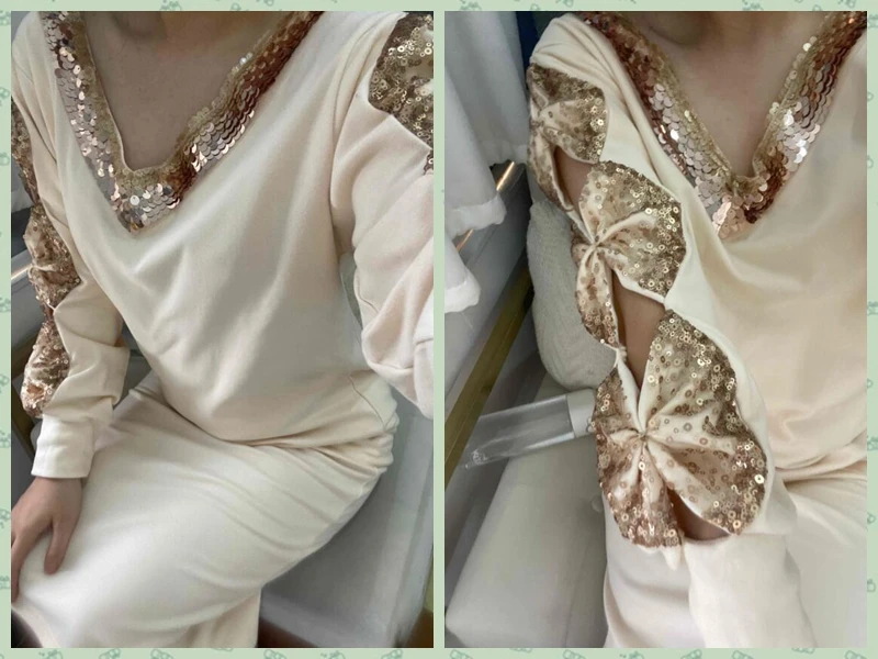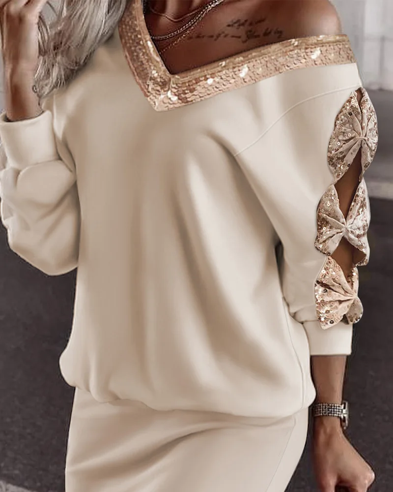 Ensemble haut à paillettes et jupe fendu , col en V, manches longues, taille haute,