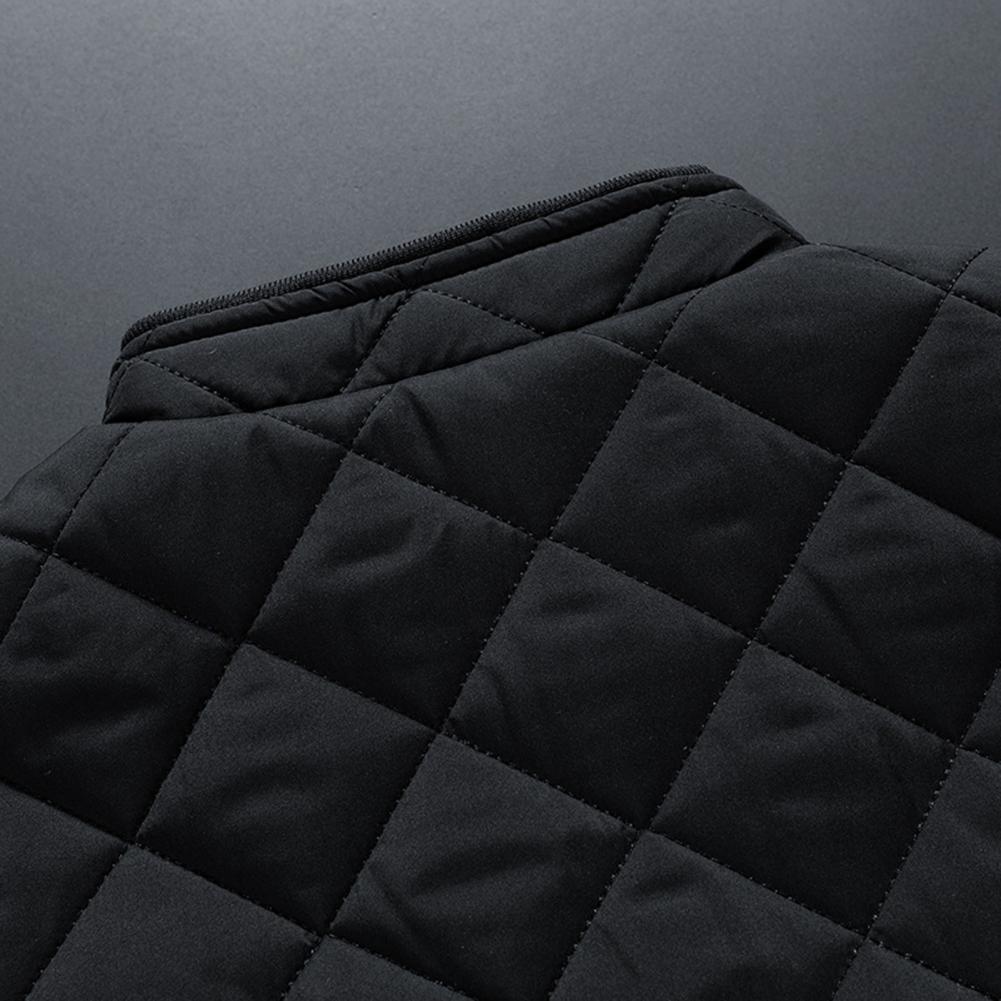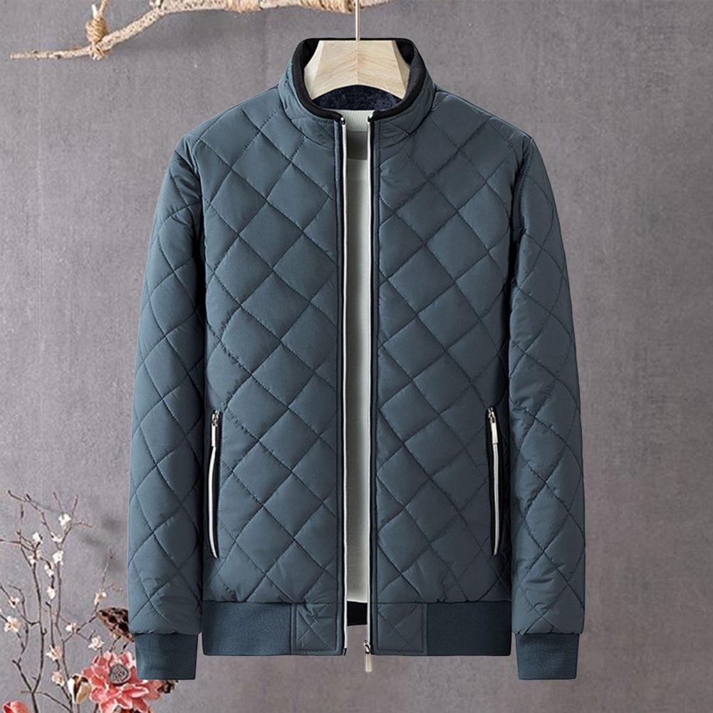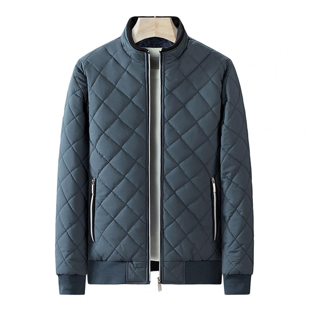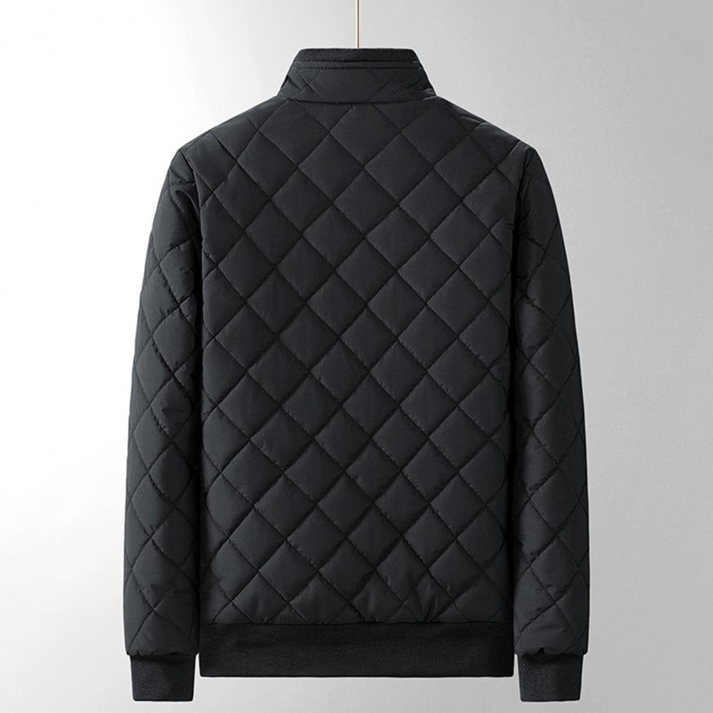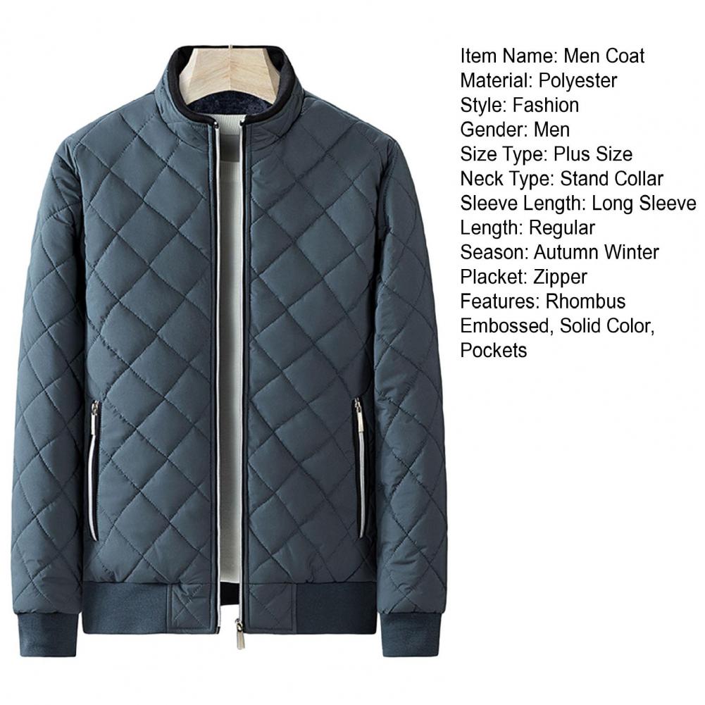 Autumn Winter Men Rhombus Embossed Jacket Stand Collar Long Sleeve Fleece Lining Zipper Placket Slim Fit Coat Solid Color Outwear