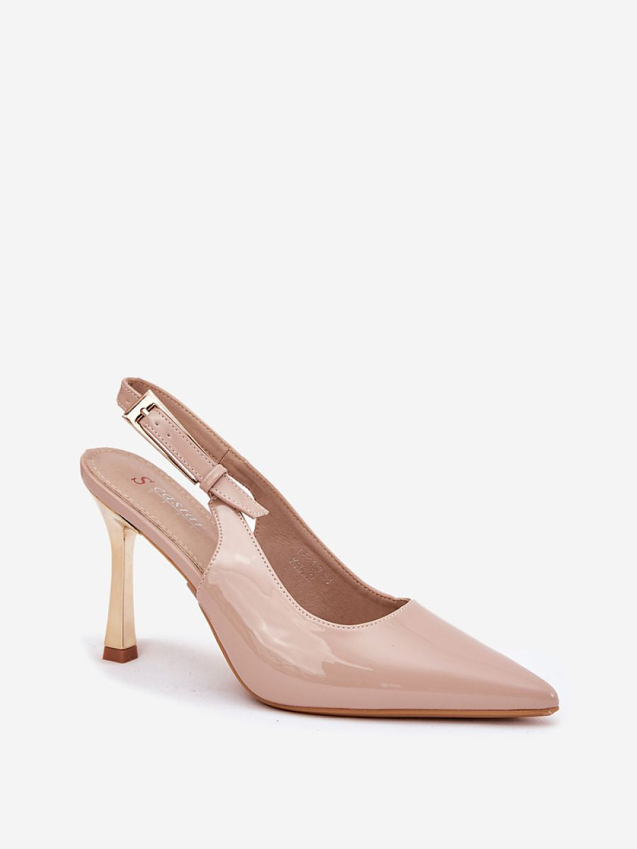 Elegant lacquered high heels with an open heel are a combination of classic and modernity. Pointed toes visually slim the legs, and fastened with an adjustable buckle strap, ensure a perfect fit and stability. These high heels will work perfectly for special occasions, combining elegance with subtle but distinct style. Ideal for evening stylizations, they add chic and confidence.