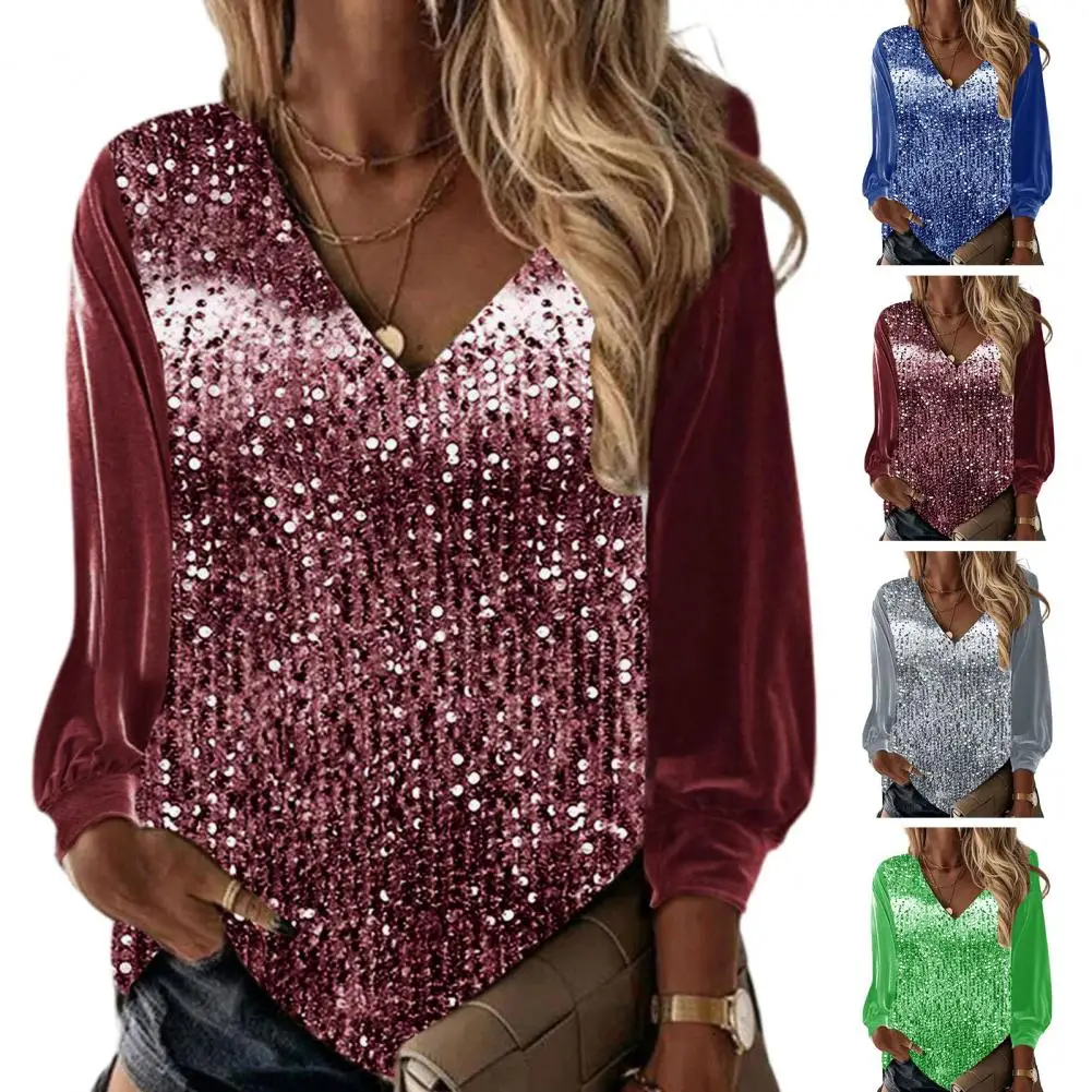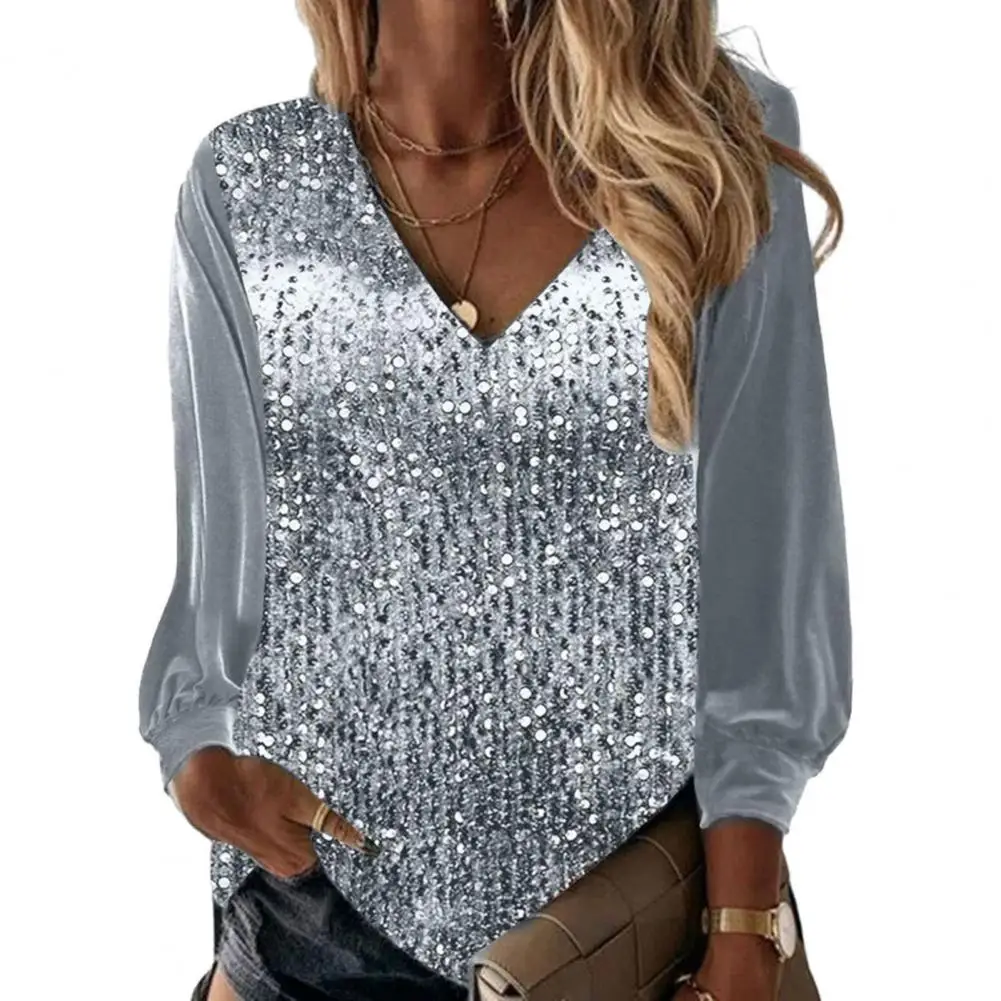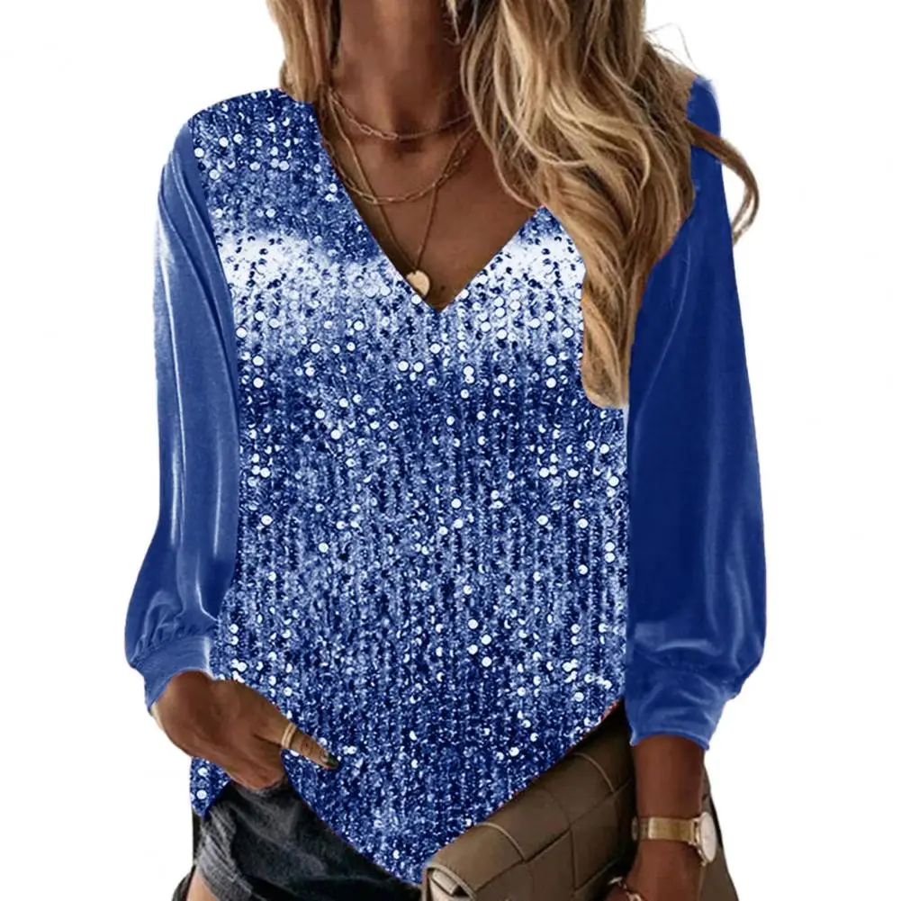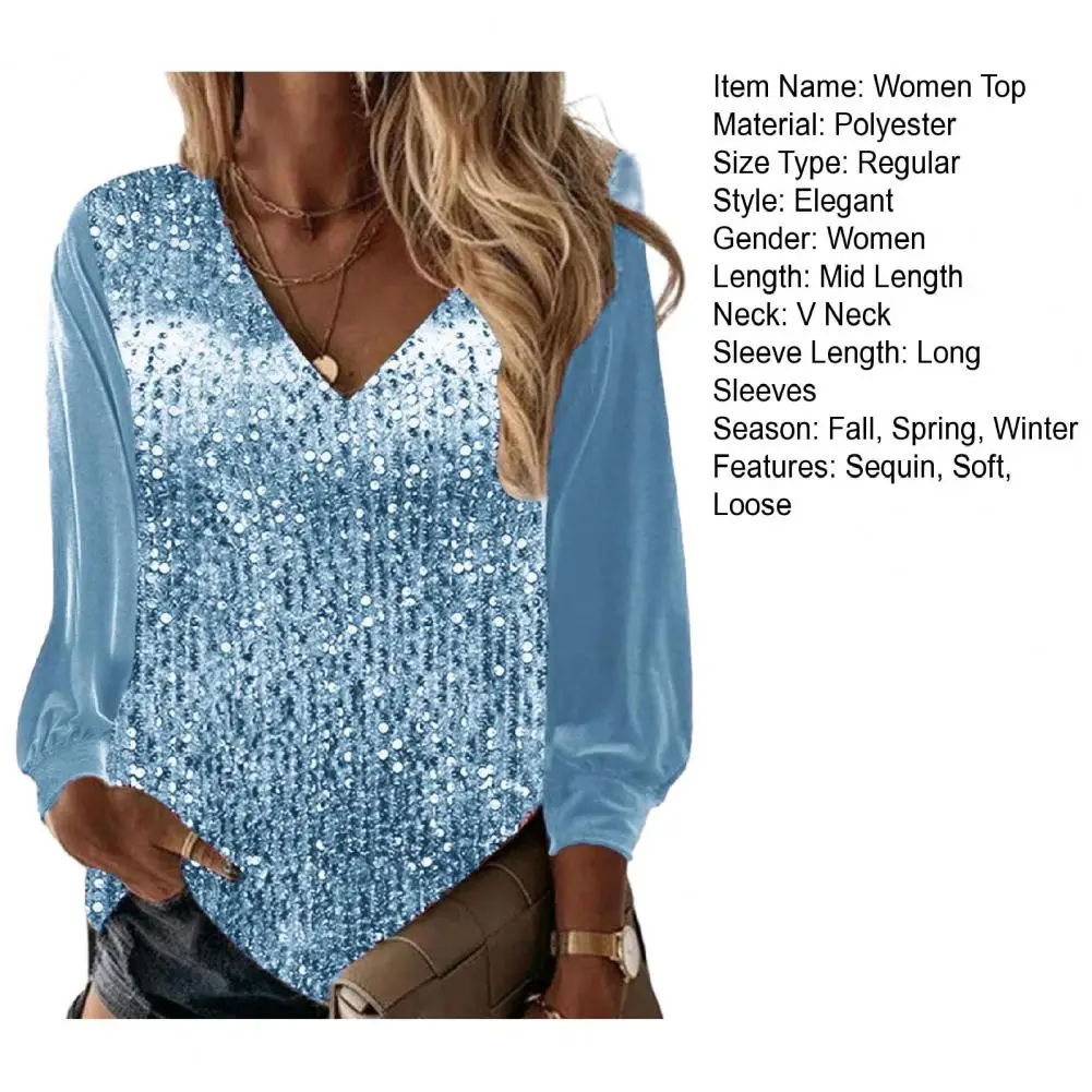 Fall Spring Women Top Shiny Sequin V Neck Long Sleeve Patchwork Loose Pullover Soft Breathable Mid Length Lady Commute Shirt Blouse