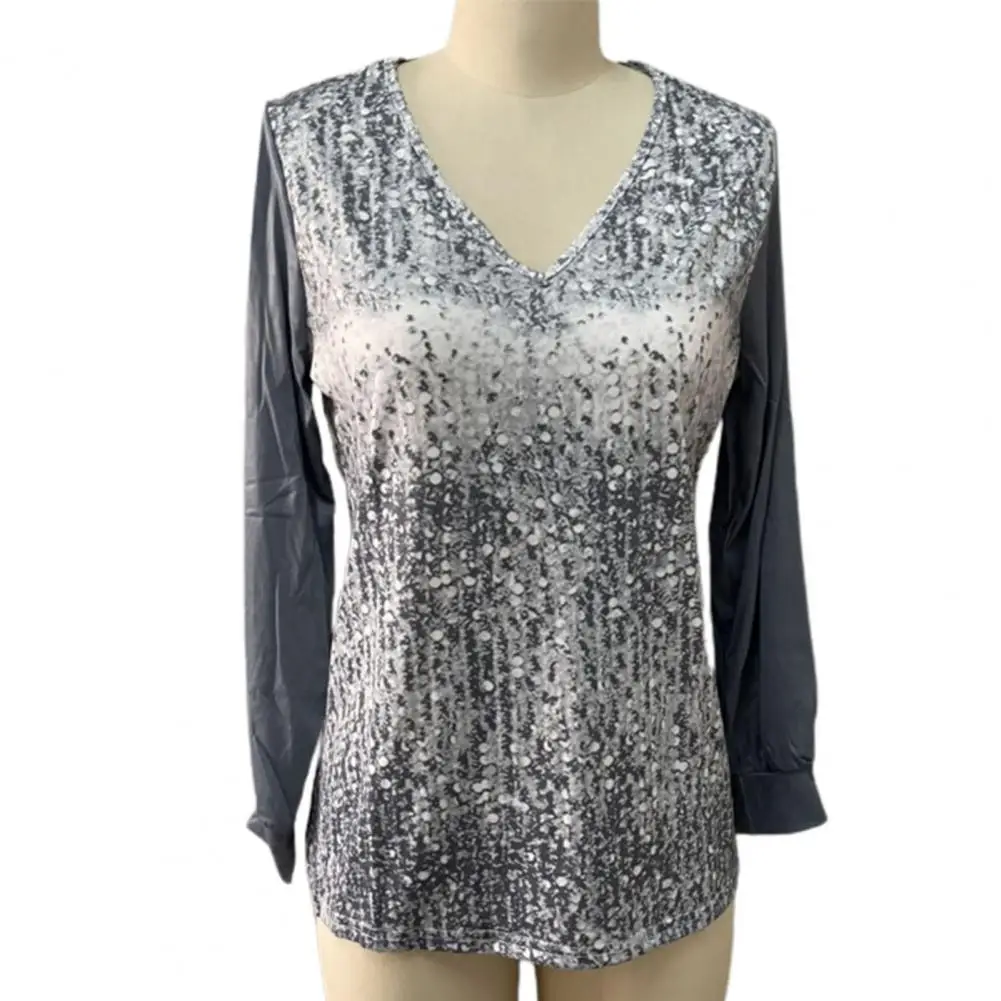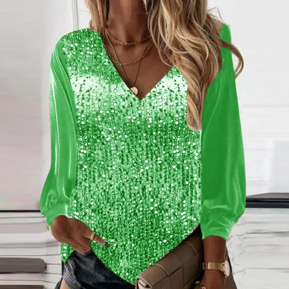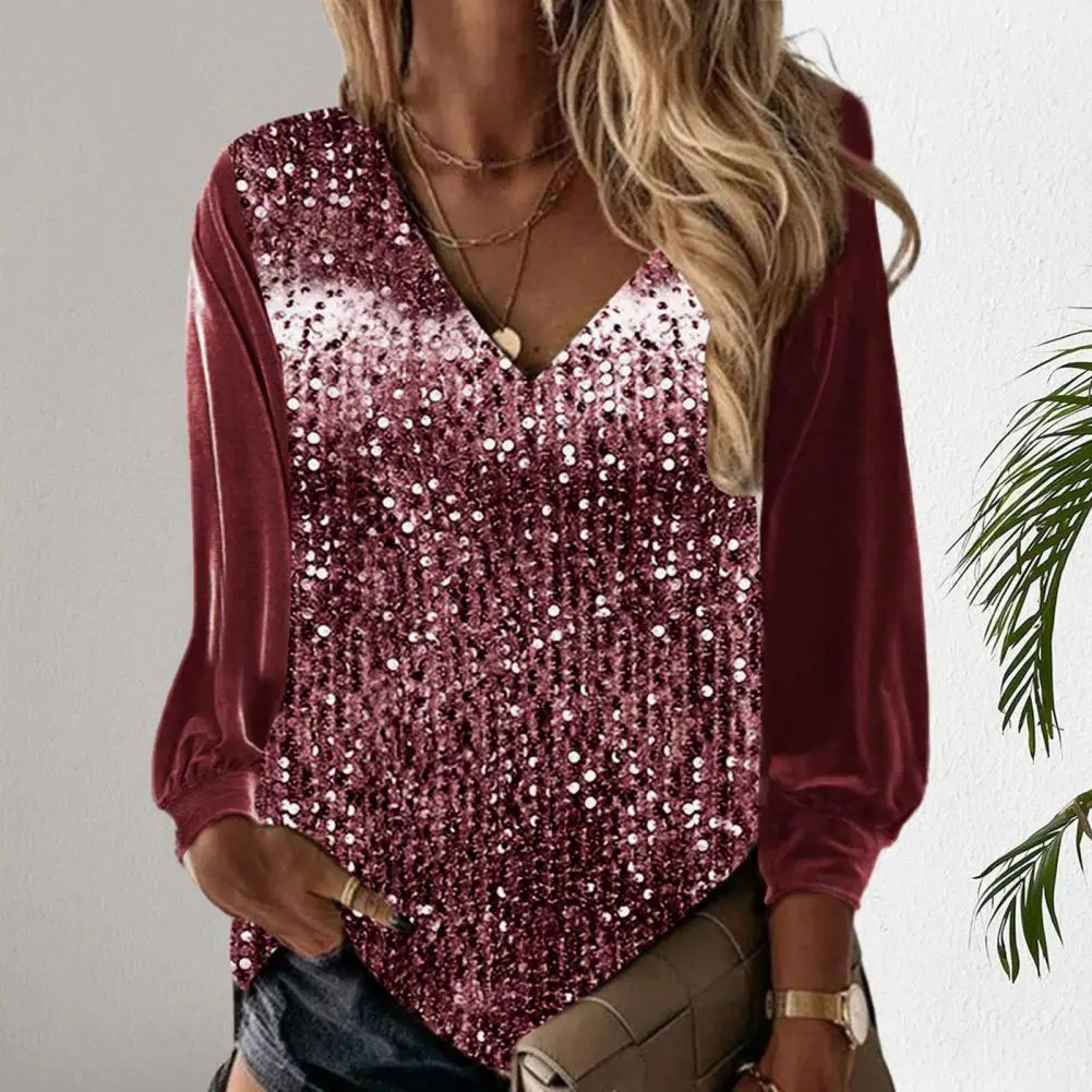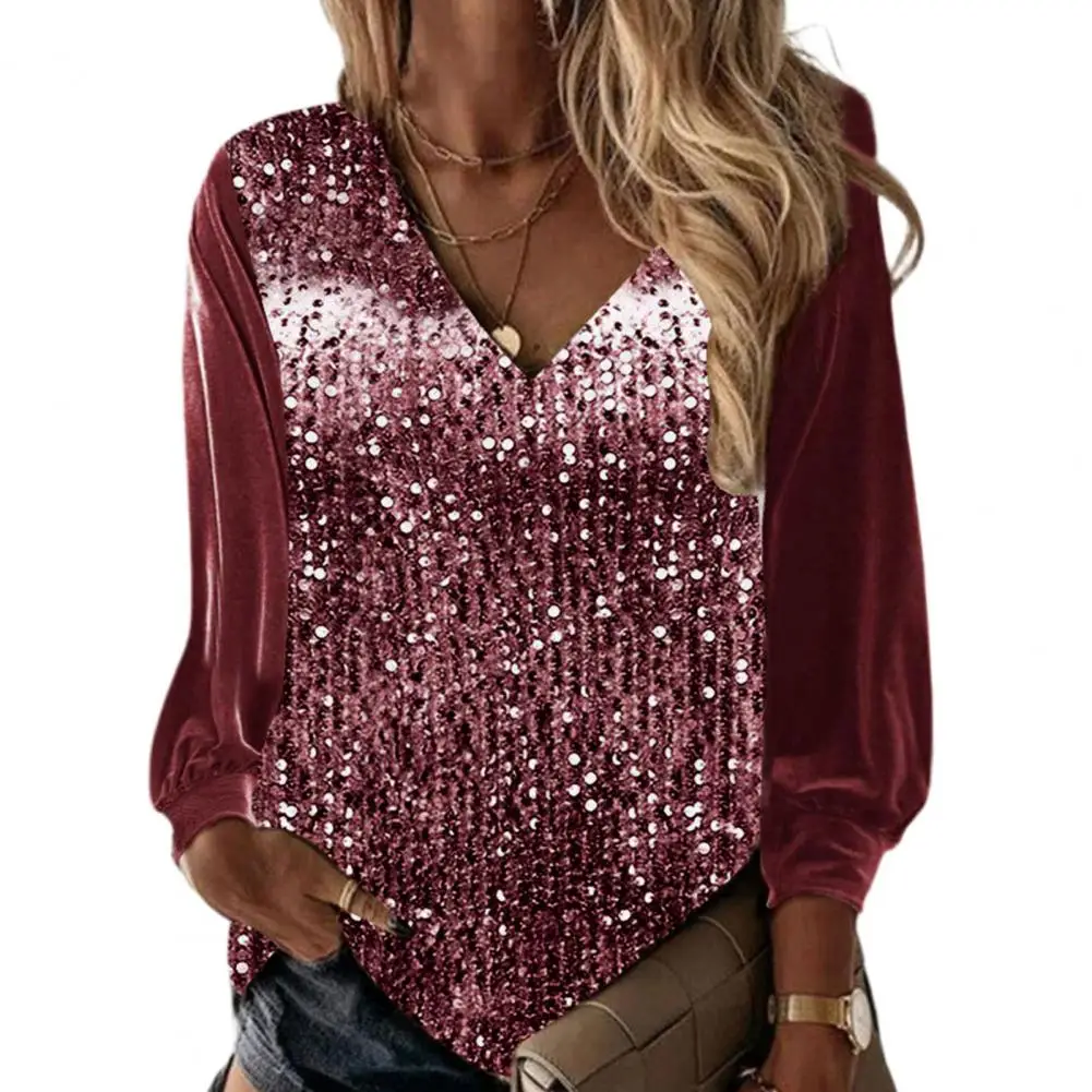 Fall Spring Women Top Shiny Sequin V Neck Long Sleeve Patchwork Loose Pullover Soft Breathable Mid Length Lady Commute Shirt Blouse