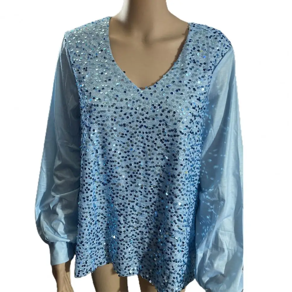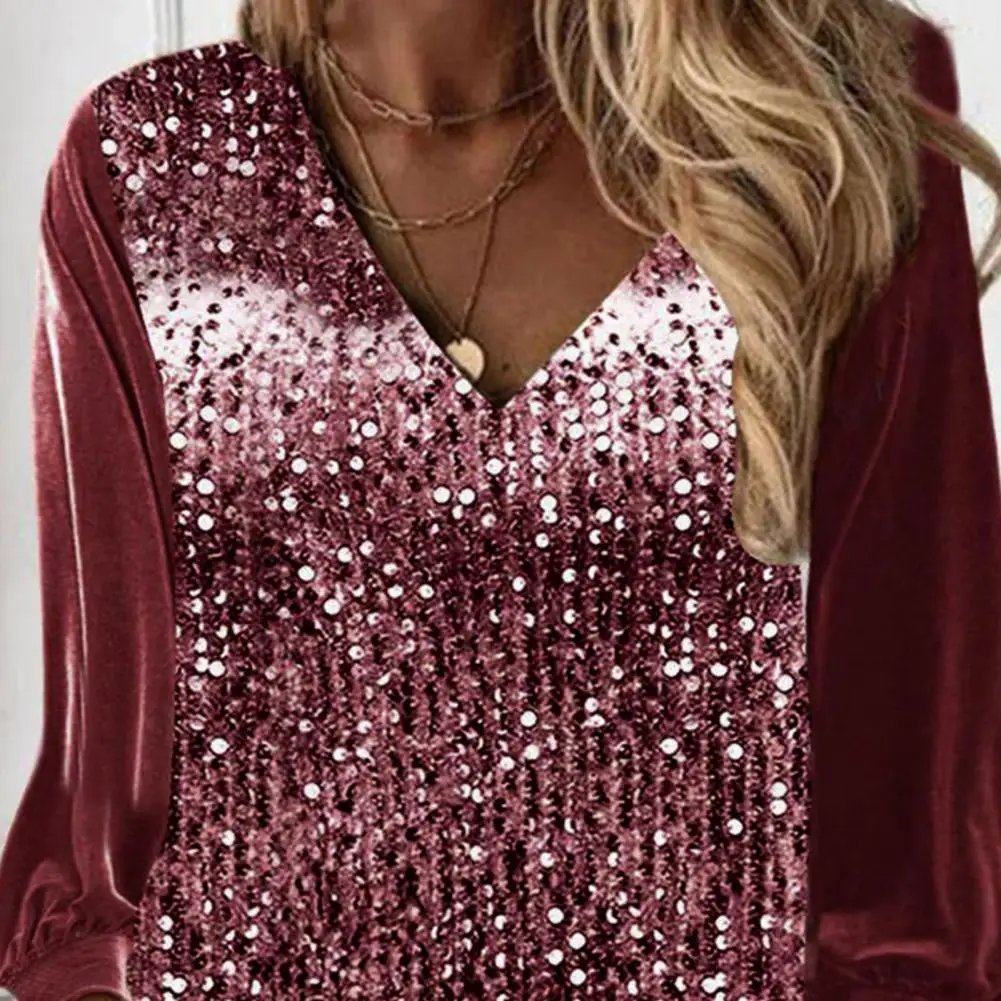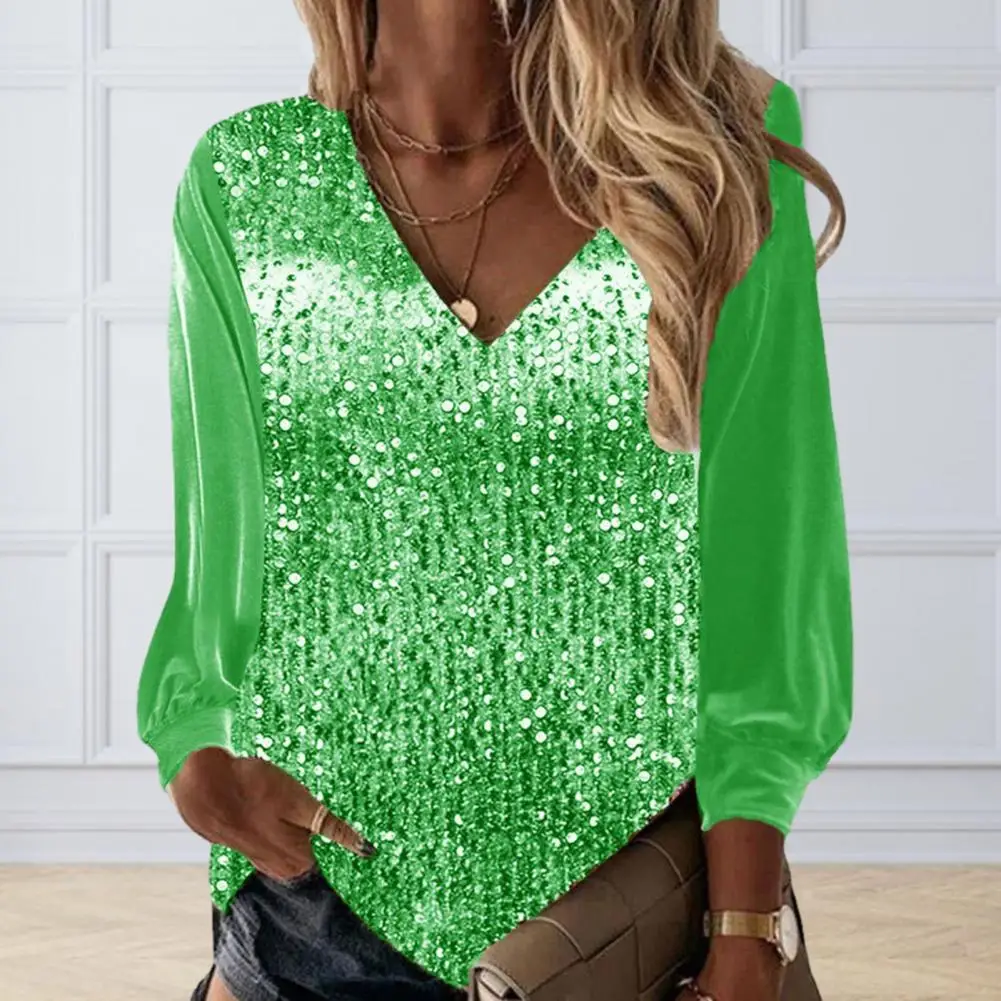 Chemisier à paillettes brillantes pour femme, col en V, manches longues
