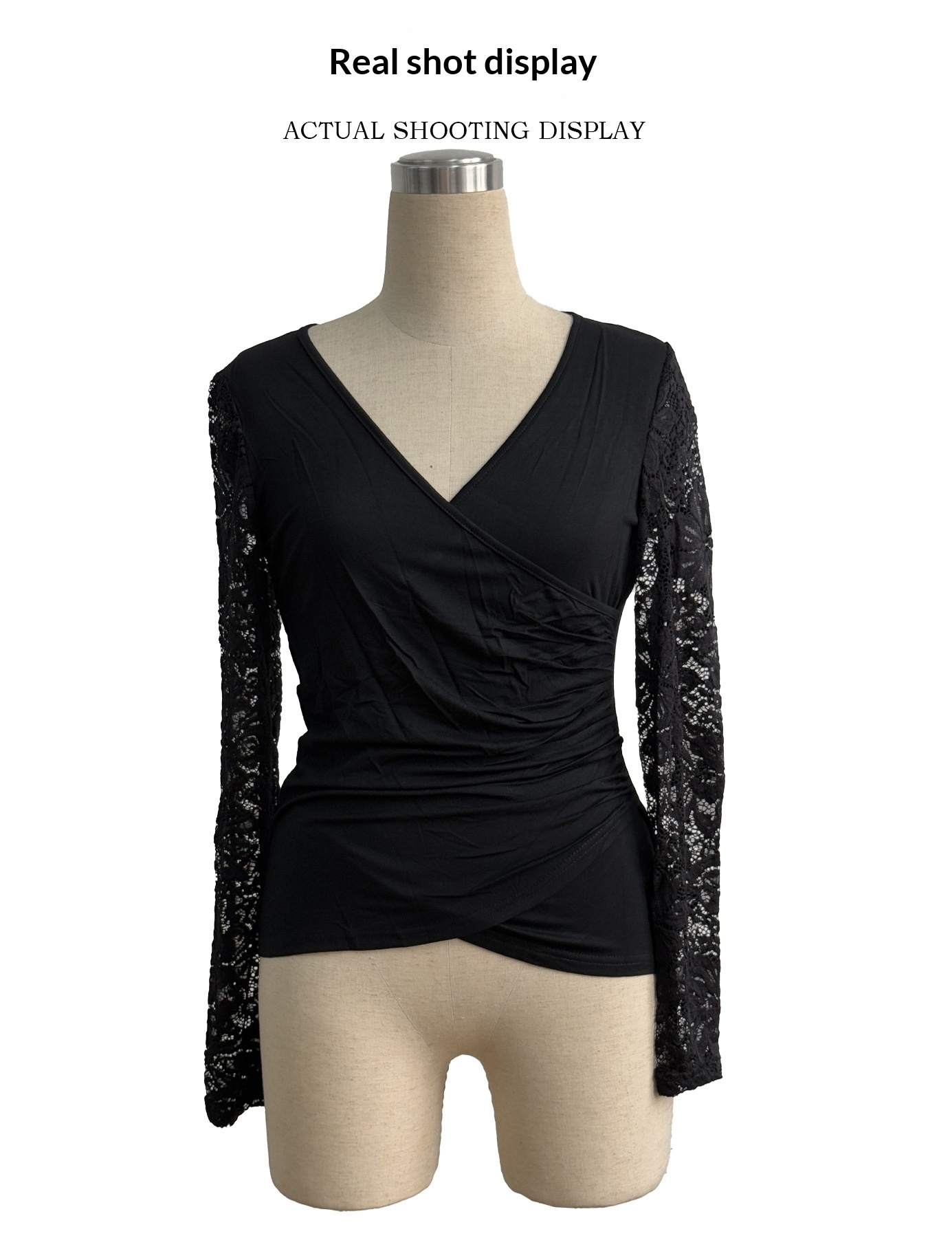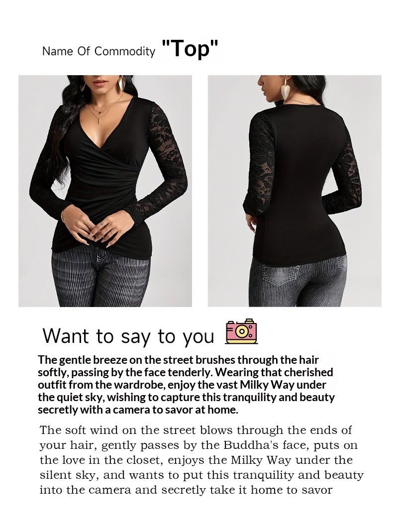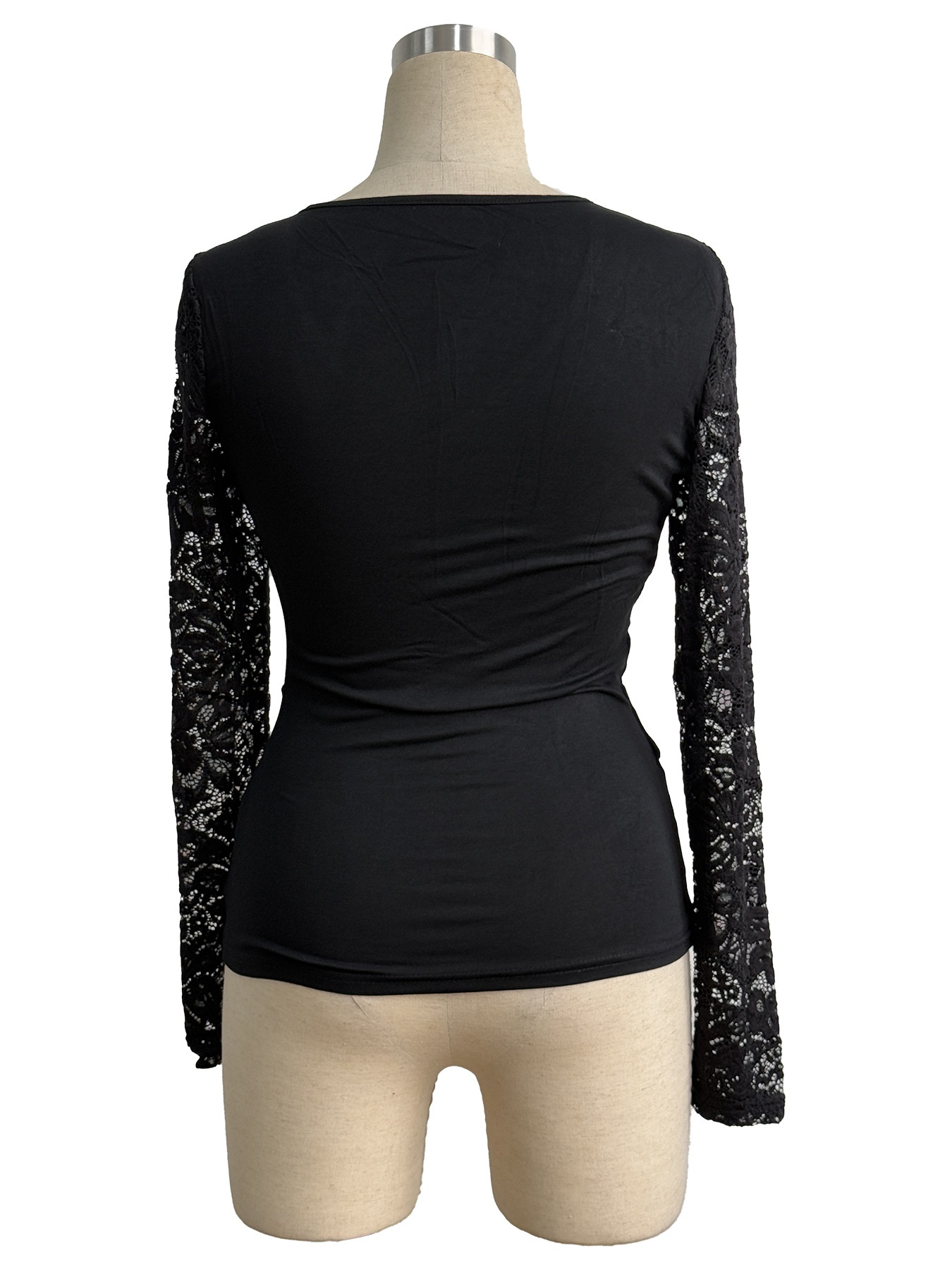 Solid-color Cross-join Lace-sleeve T-shirt
