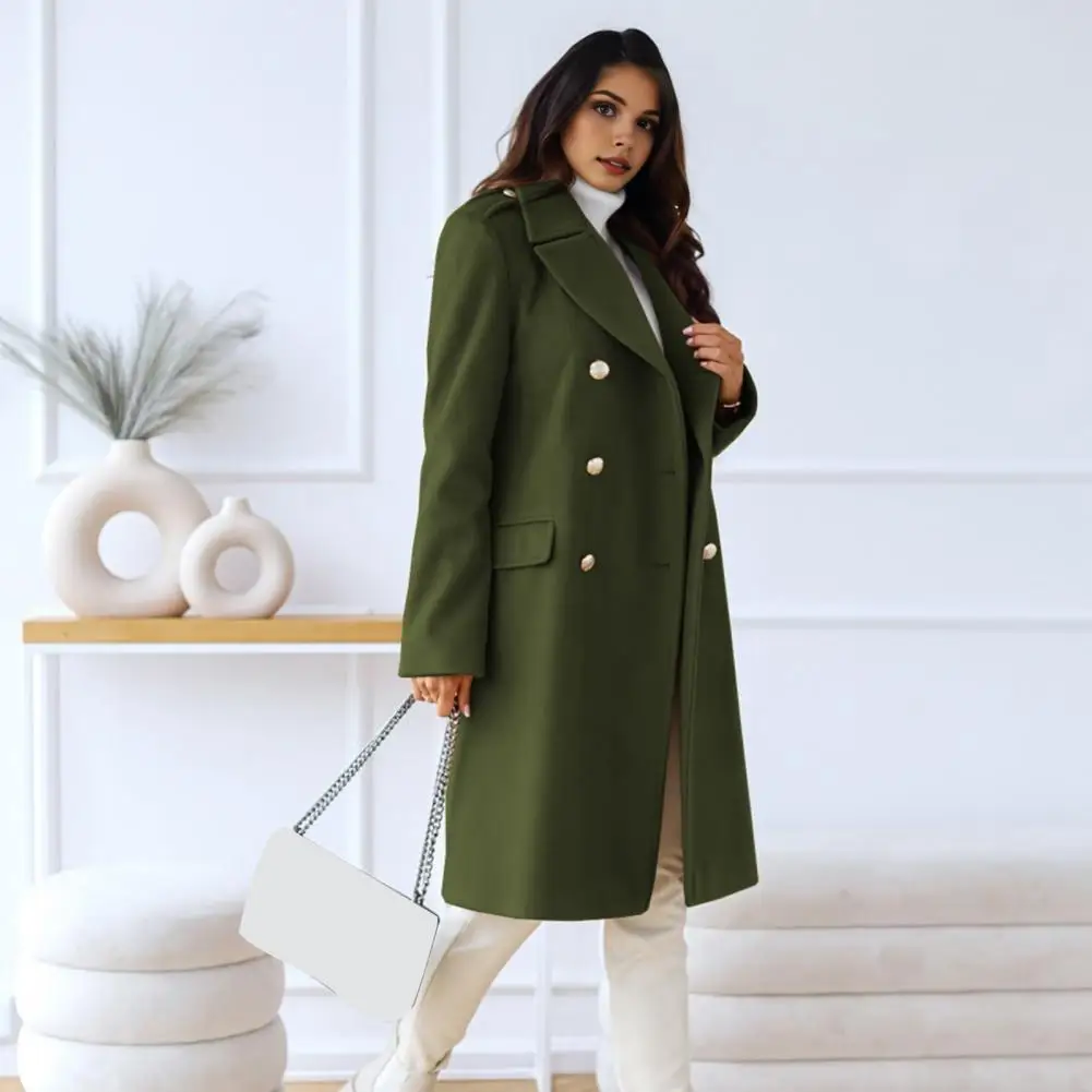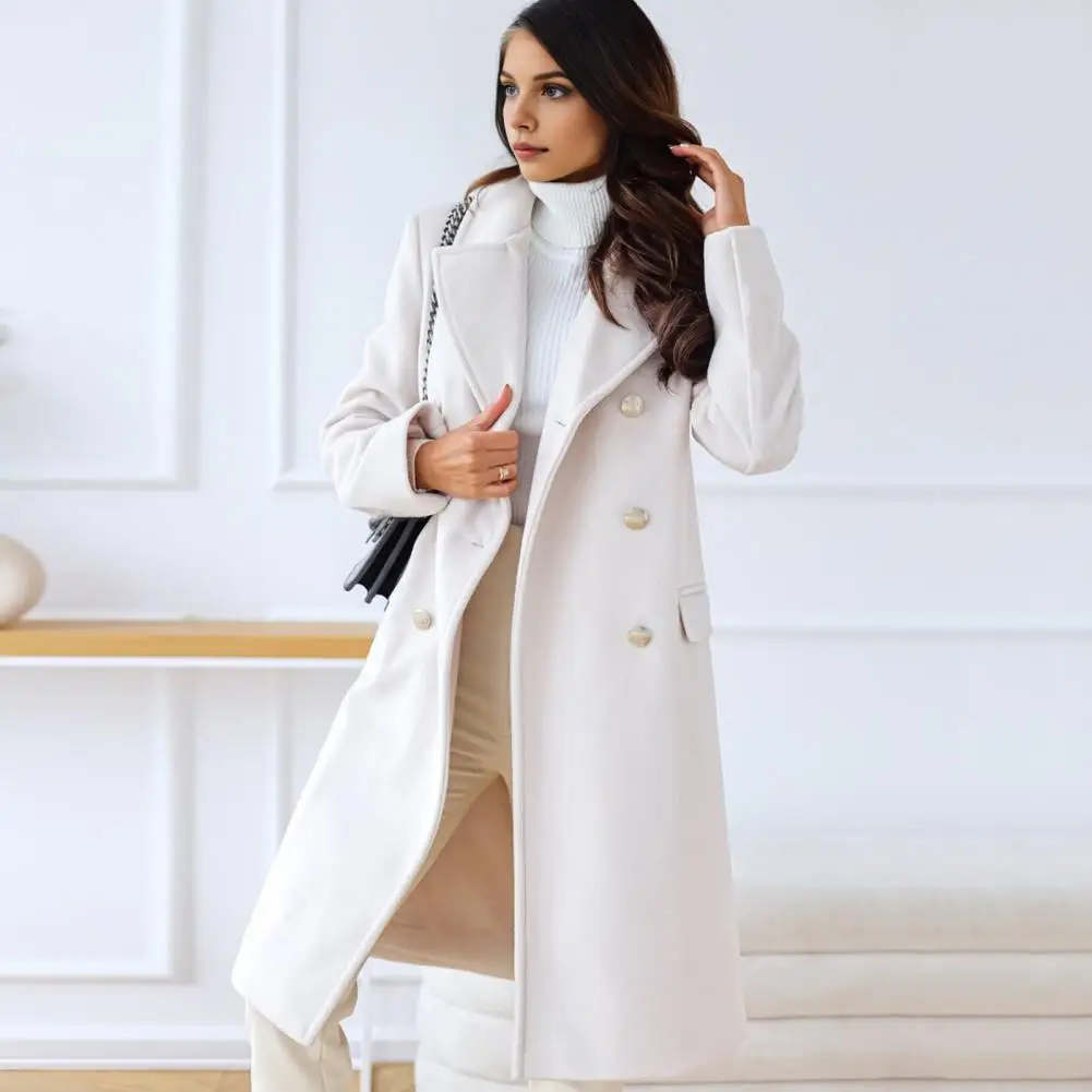 This women's coat boasts a fashionable and understated design, complete with classic suit lapels, long sleeves, and a double-breasted closure. The long length adds sophistication to any outfit, making it a versatile piece that can be effortlessly paired with T-shirts, dresses, or vest. Whether you're heading to work, school, outdoor adventures, or social gatherings, this coat is perfect for all occasions.