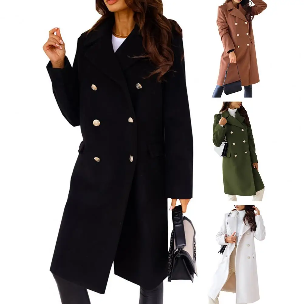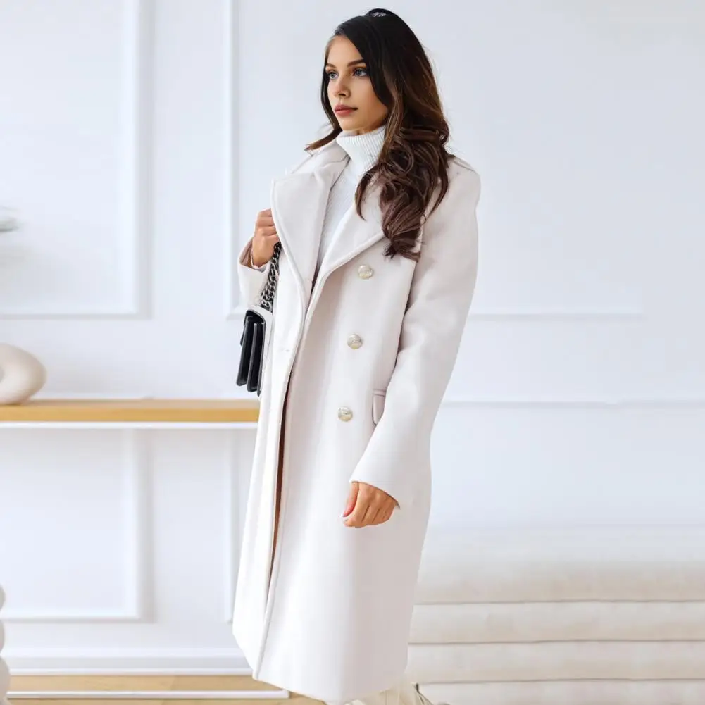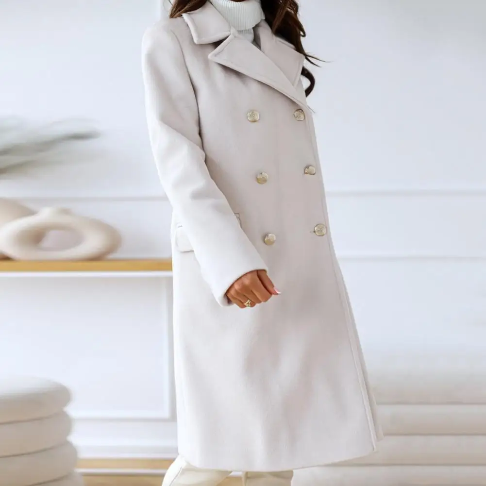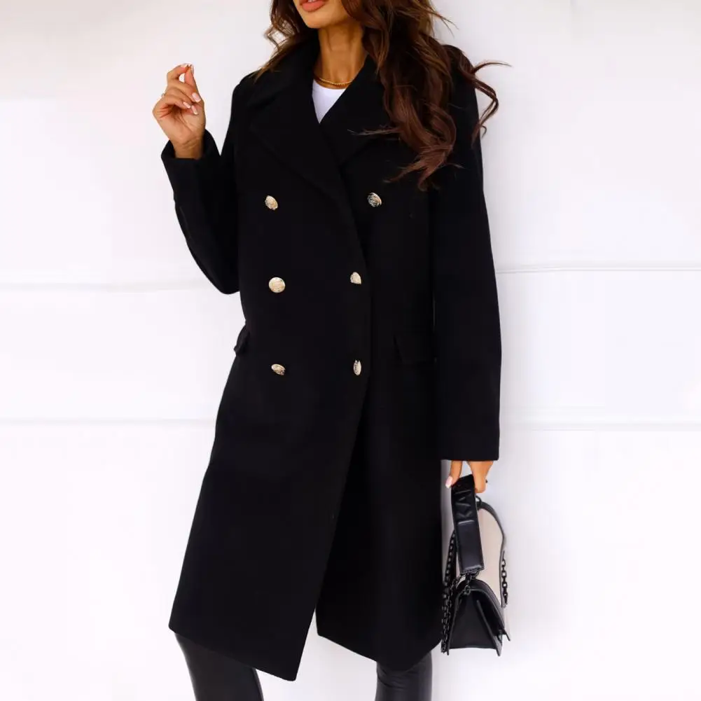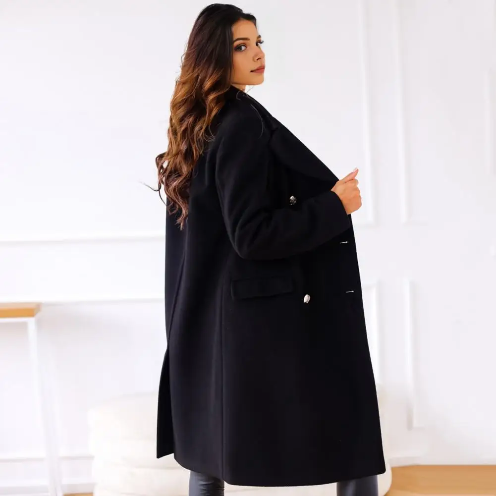 Women Winter Overcoat Turn-down Collar Pockets Pure Color Double-breasted Cardigan Loose Fit Coat Thermal Long Sleeves Commuting Dating Winter Coat