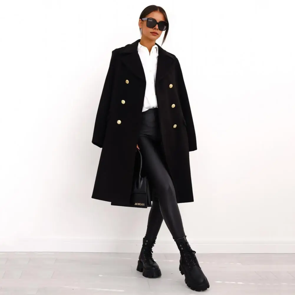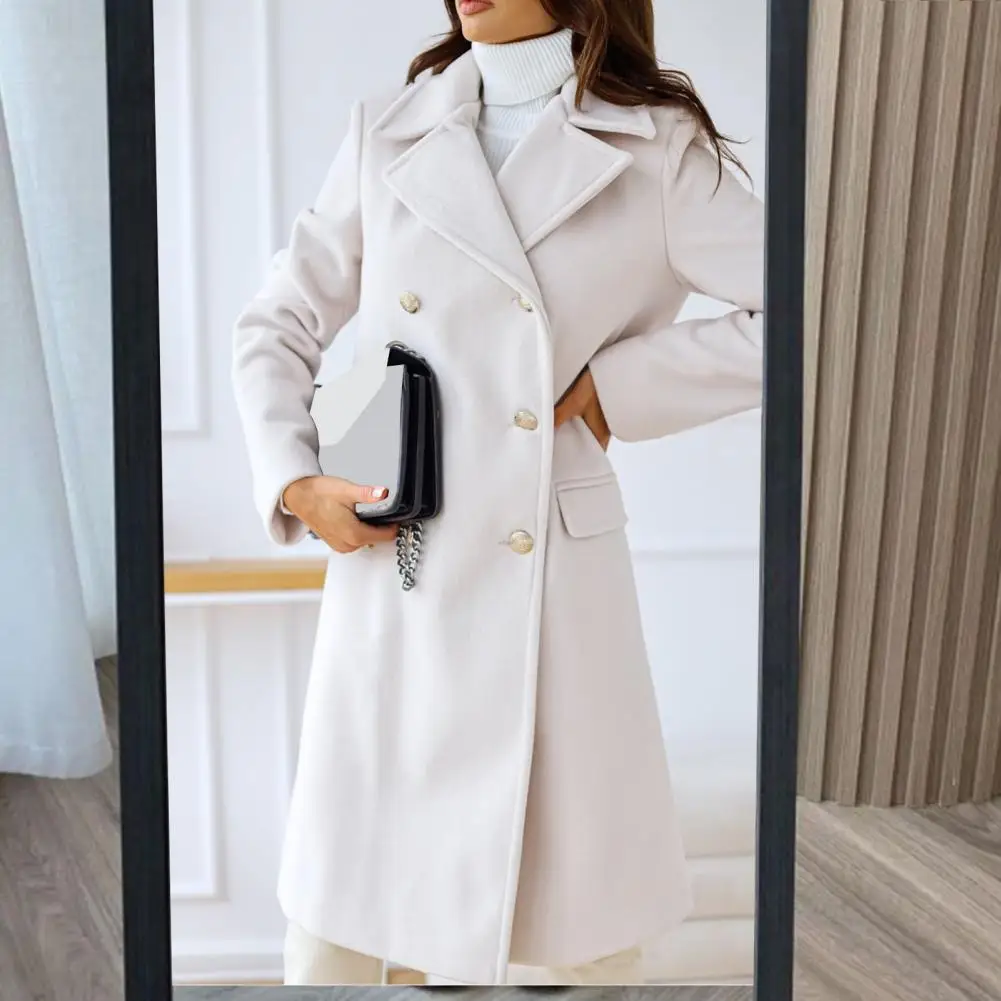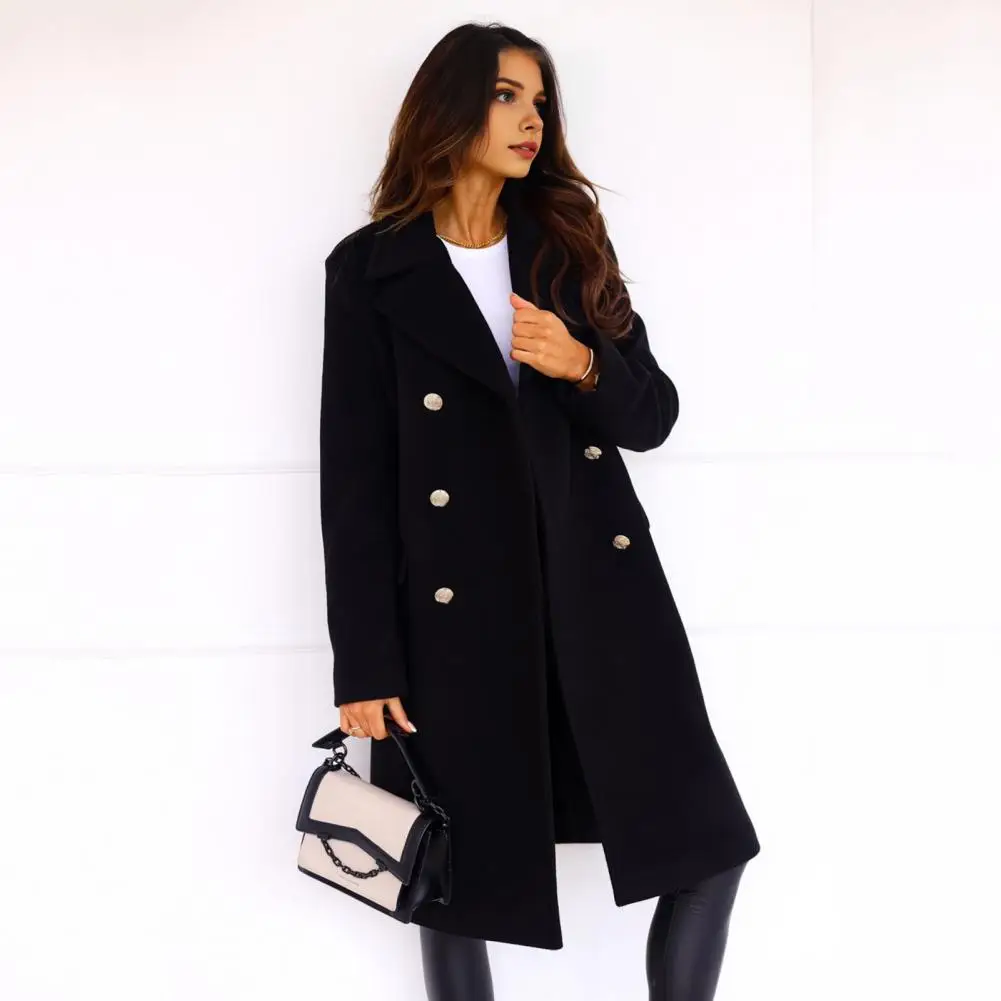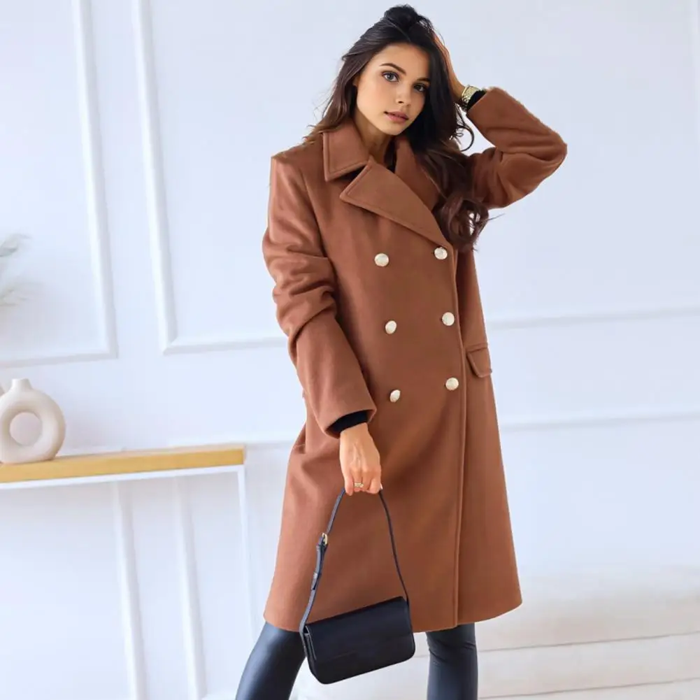Women Winter Overcoat Turn-down Collar Pockets Pure Color Double-breasted Cardigan Loose Fit Coat Thermal Long Sleeves Commuting Dating Winter Coat