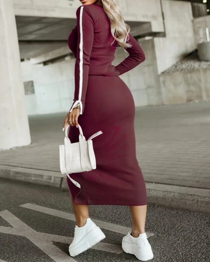 Women's Athletic Style Suits 2025 Autumn Winter Latest 2 Piece O-Neck Pullover Long Sleeve Top Slit Front Skirt Set Tracksuit