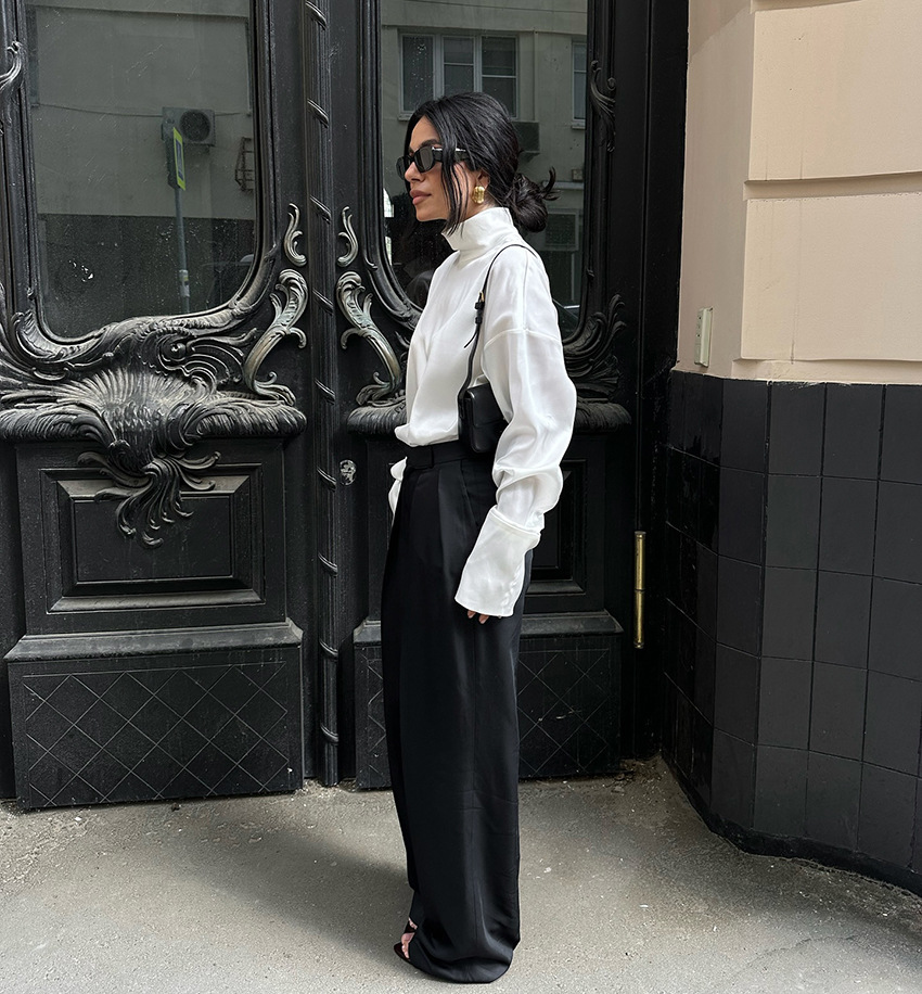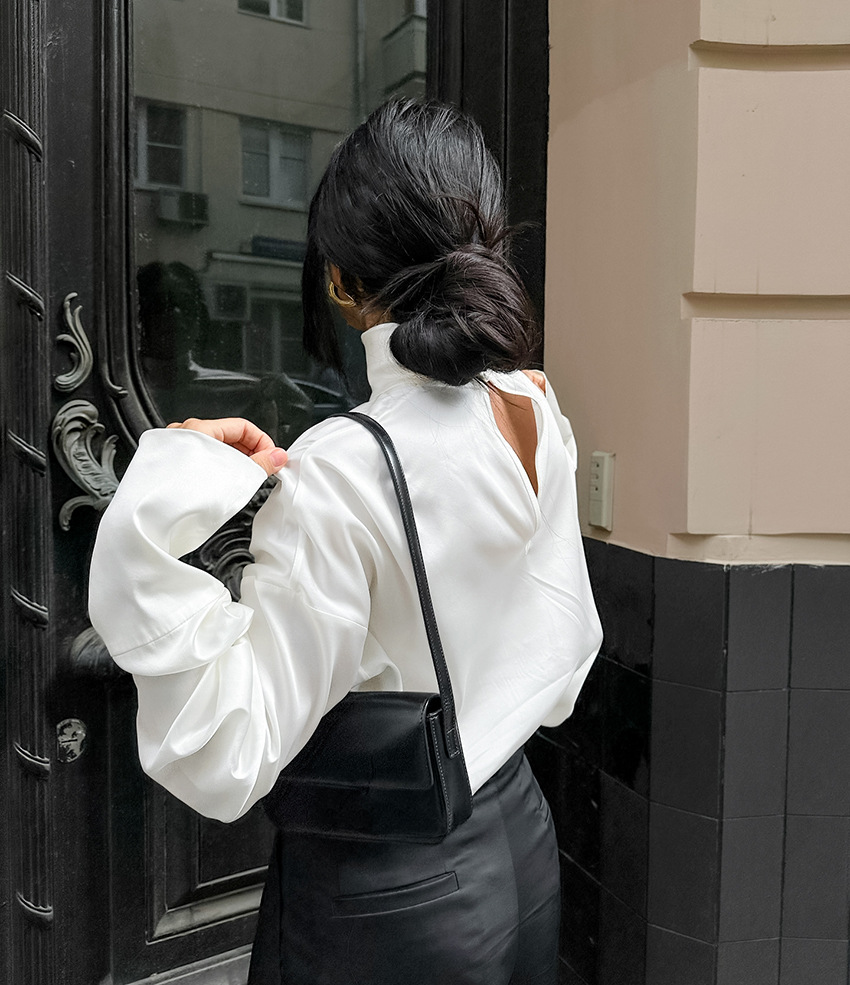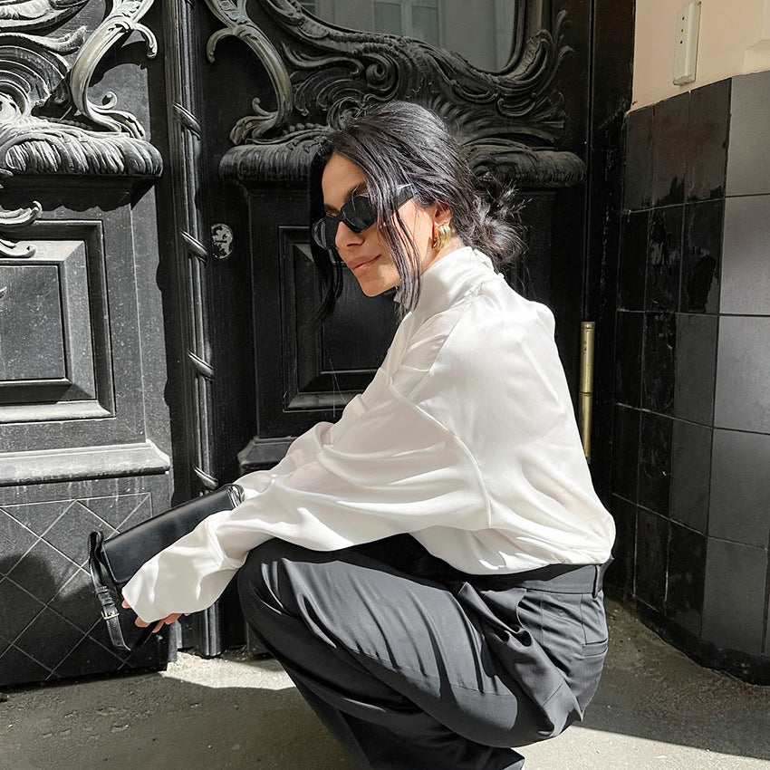 Women's Elegant High-neck White Workwear-style Relaxed-fit Long-sleeve Top